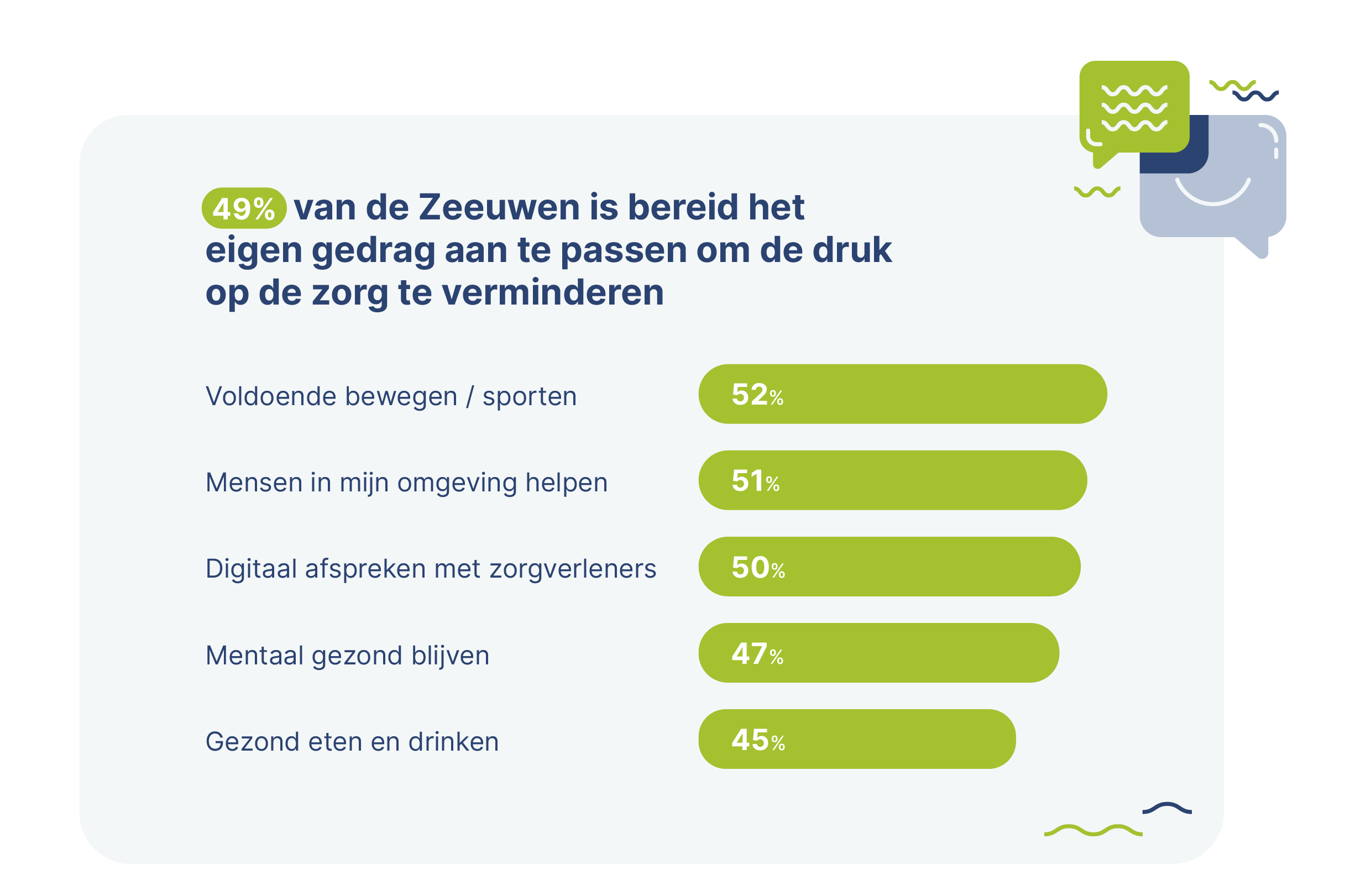 Onderzoeksbureau Newcom onderzocht hoe inwoners denken over de verandering in de zorg in Zeeland. In totaal hebben ongeveer 1.100 Zeeuwse inwoners, zorgprofessionals en gemeenteprofessionals de vragen beantwoord. Het onderzoek toont aan dat de meeste Zeeuwen bekend zijn met de uitdagingen in de zorg en inzien dat veranderingen nodig zijn, ook voor zichzelf. Inwoners geven aan meer te willen gaan bewegen, mensen in de naaste omgeving helpen en digitaal afspreken met zorgverleners. Ook willen ze werken aan gezond eten en drinken en mentaal gezond blijven. “Belangrijke informatie voor ons als Zeeuwse Zorg Coalitie,” licht Kuijs toe. “In Zeeland werken we nauw samen met inwoners, zorgaanbieders, alle Zeeuwse gemeenten en zorgverzekeraar CZ. En de Zeeuw zelf speelt ook een belangrijke rol bij de veranderingen die de zorg beschikbaar houden. Het is een van de redenen waarom we de campagne ‘Samen houden we Zeeland gezond’ zijn gestart.”